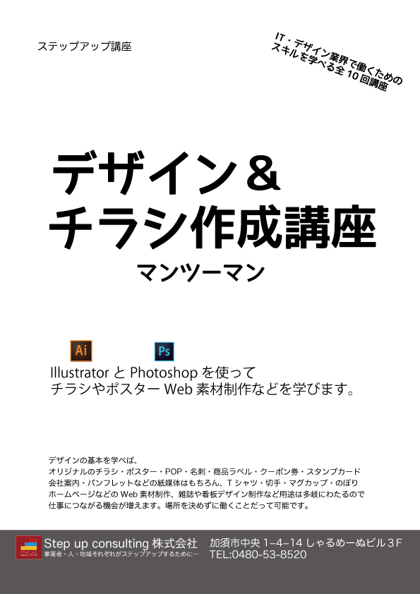 オリジナルチラシ・ポスター・POP・名刺・商品ラベル・クーポン券・スタンプカード・社内案内・パンフレットなどの紙媒体はもちろん、Tシャツ・切手・マグカップ・のぼり・ホームページなどのWeb素材制作、雑誌や看板デザイン制作など用途は多岐にわたるので仕事のスキルアップや仕事につながる機会が増えます。